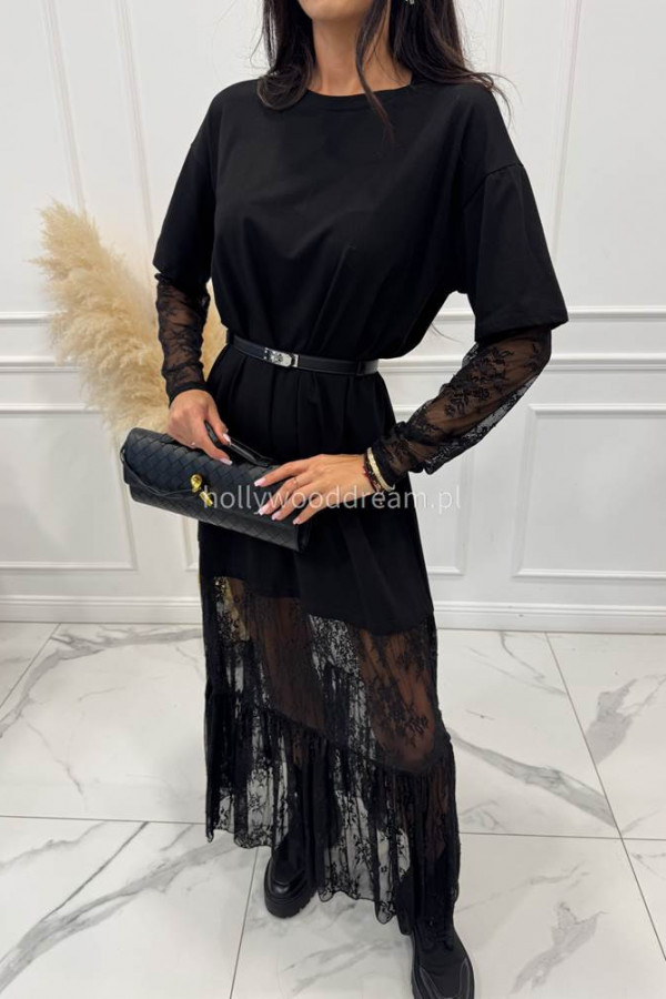 - Czarna sukienka maxi oversize z koronkowym dołem i rękawami INGA